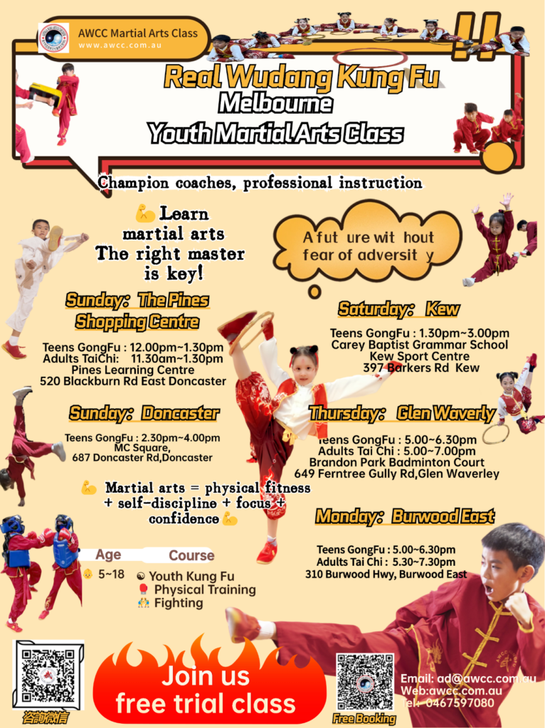 In order to meet the strong demand of Australians who are eager to learn authentic Chinese Wudang Kung Fu, the AWCC Wushu Center will start to run Chinese Wudang Kung Fu Youth Martial Arts Classes are held year-round in 【 the following ten areas in Melbourne. 】