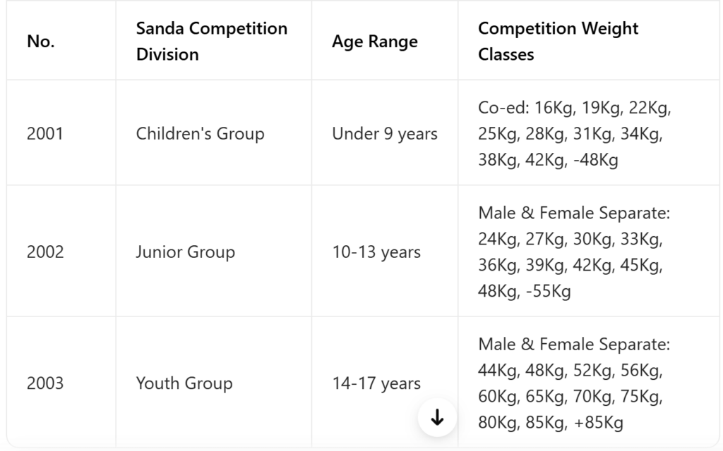 - Sanda and Taekwondo Combat Competitions:Only a minor category is available. Adopt a single-round system, only one round. For Children’s Group, each round has 2 minutes of net fighting; for Junior Group, each round has 3 minutes of net fighting. Athletes must weigh in with protective gear upon entering the competition. If the weight exceeds the registered category by more than 2kg without gear, the opponent may win by default if unwilling to compete.