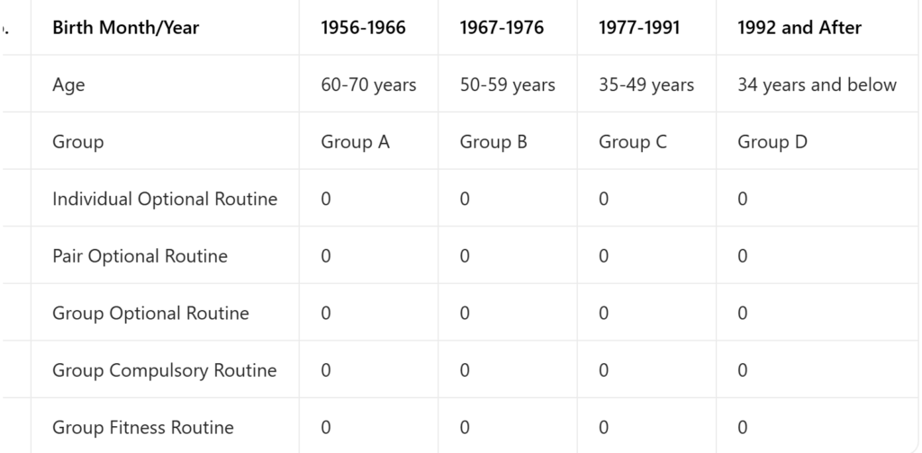 - Individual events are not allowed to cross age groups. Duet and group events are not divided into male and female groups, and may cross age groups. For group events, the age is based on the oldest member of the team.