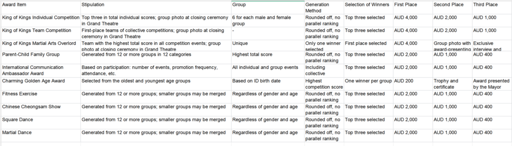 Generated from the oldest and youngest age groups. Based on the date of birth on the ID card, one winner with the highest total score in the oldest age group and one winner with the highest total score in the youngest age group will be selected respectively. Each winner will be awarded 1000 RMB or 200 AUD in cash + trophy + certificate + group photo with the Mayor and distinguished guests during the award ceremony, with coverage by major Chinese and international media. Selected outstanding programs will be invited to participate in the closing ceremony and perform on stage with renowned Chinese and foreign masters.