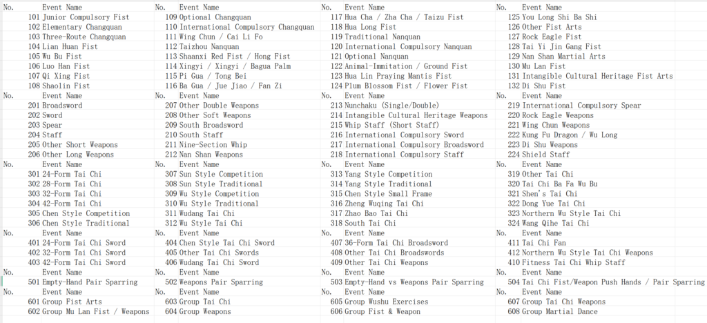 - Wushu Routines, Health Qigong, Techniques, etc. Competitions